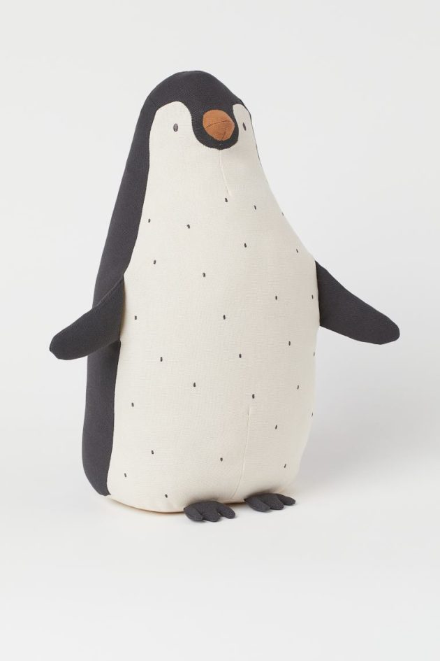 Soft toy made of cotton tarpaulin in the shape of a penguin. With applications and embroidered details. Width 17.5 cm. Depth 22 cm. Height 38.5 cm.